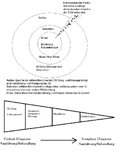 Mitte: Die Methoden in der TCM, je tiefer ein Problem ist, je Schicht wird behandelt.